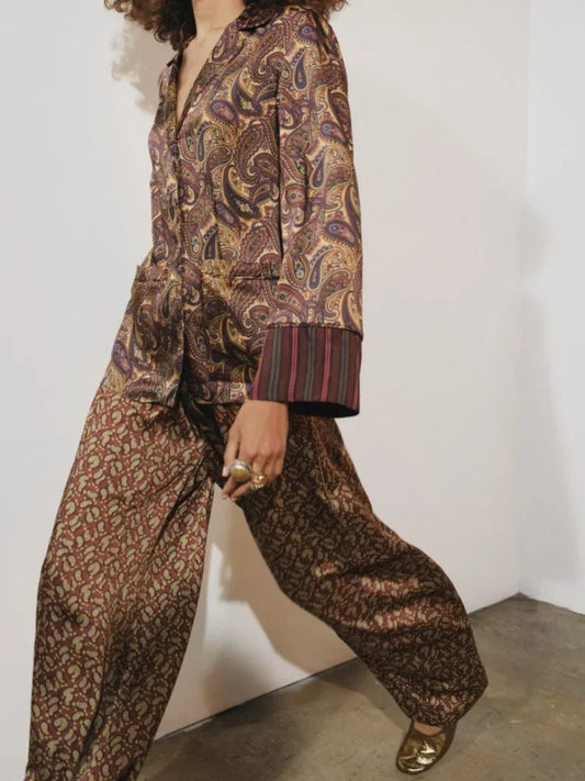 Versatile Printed Pocket Lapel Wide Leg Pant Set Women's Suit